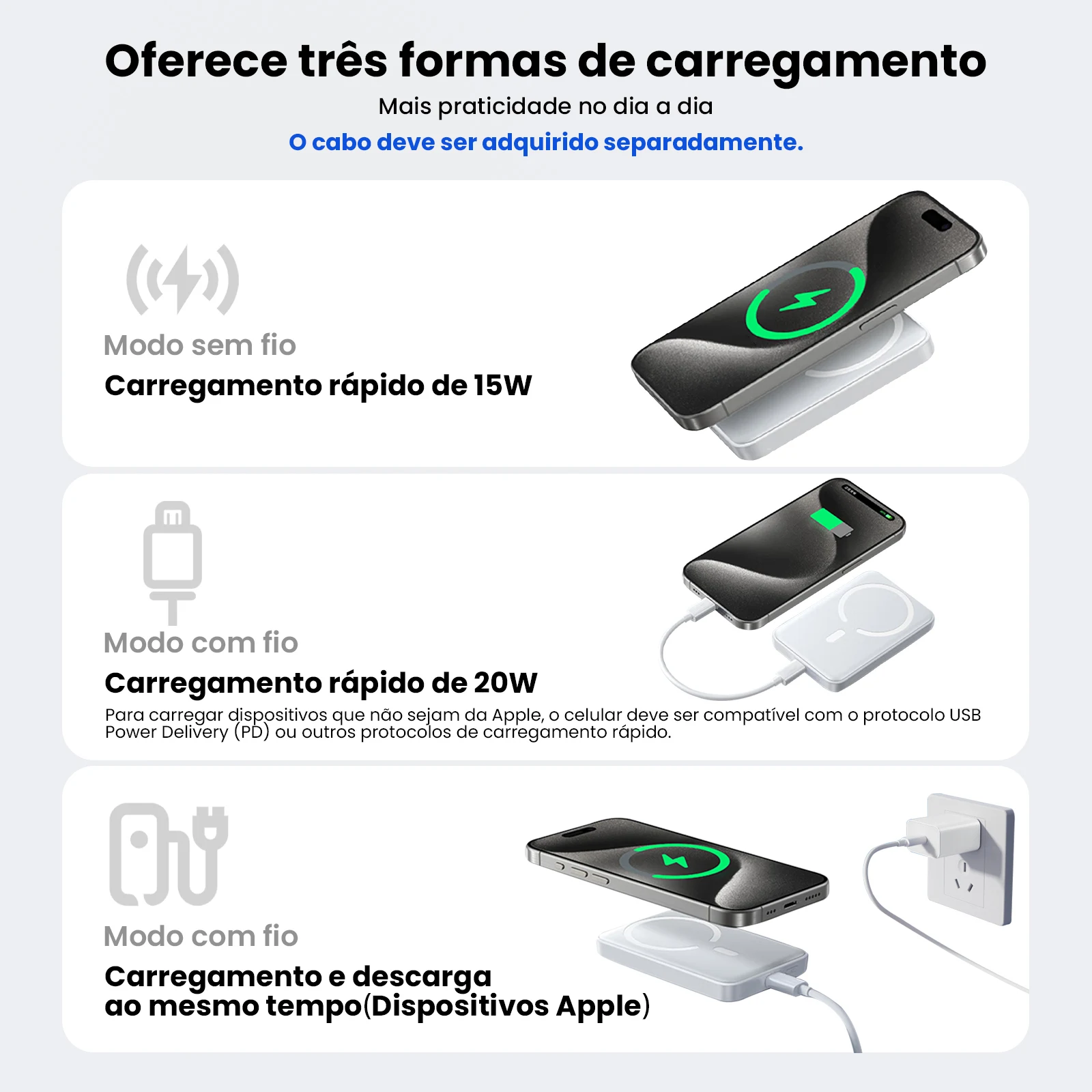 Potência de Saída: Até 15W via cabo Lightning (não incluso)