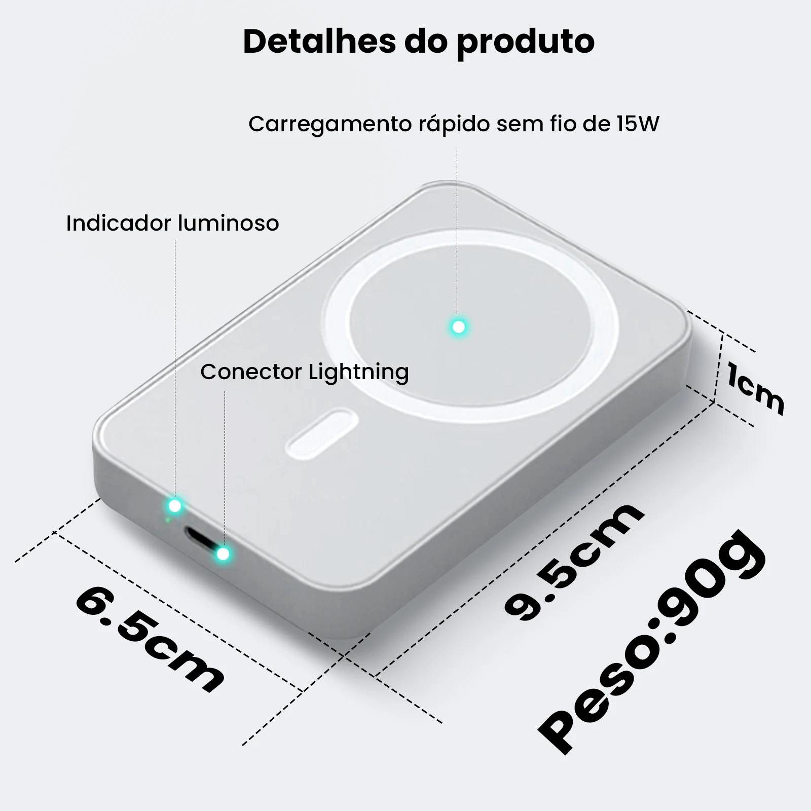 Design: Compacto e portátil (9,5 × 6,5 × 1 cm) com peso leve (90g)