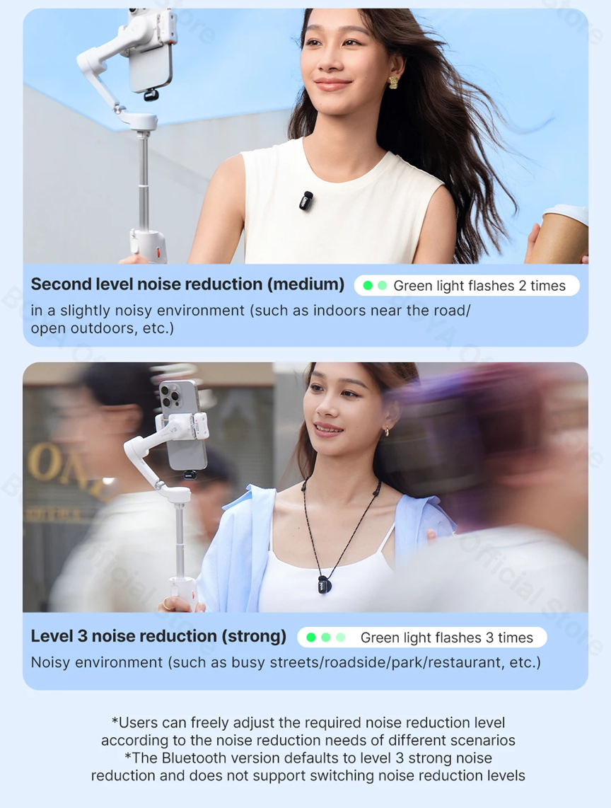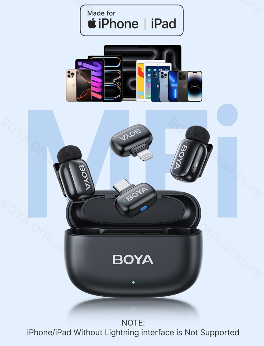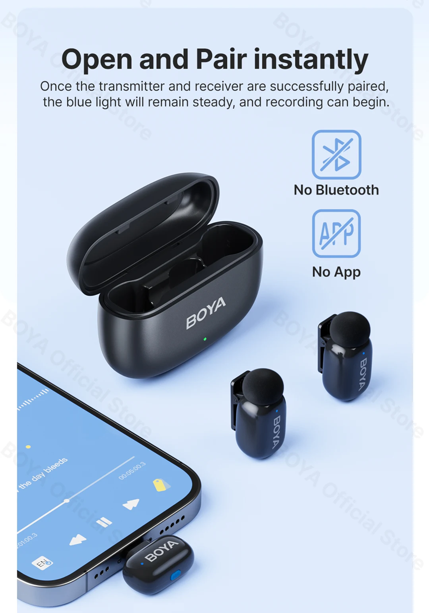 Especificações – Microfone de Lapela Sem Fio BOYA Mini (1TX-1RX com Estojo) – Conexão USB-C