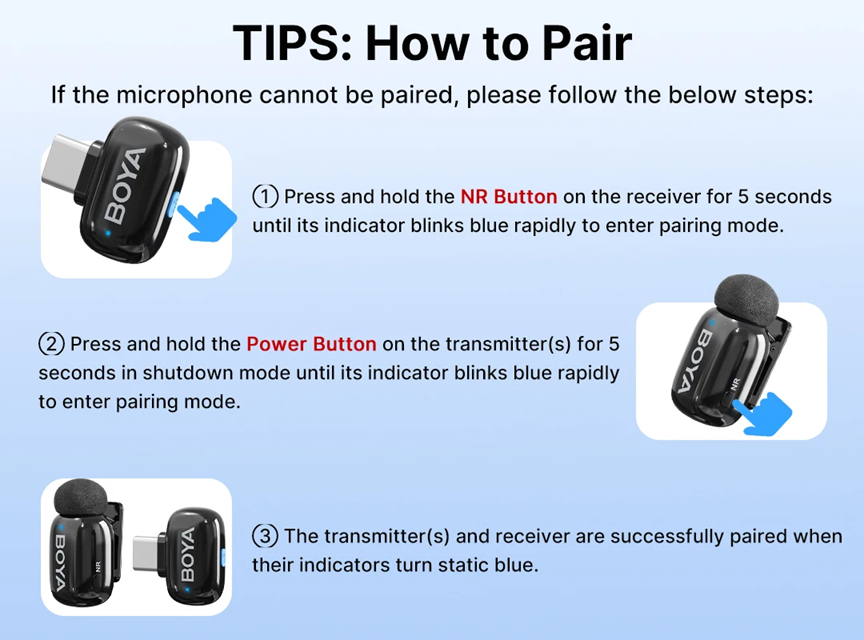 Emparelhamento manual: pressione o botão “NR” do receptor por 5 segundos e o botão “Power” do transmissor desligado por 5 segundos até os LEDs ficarem azuis fixos