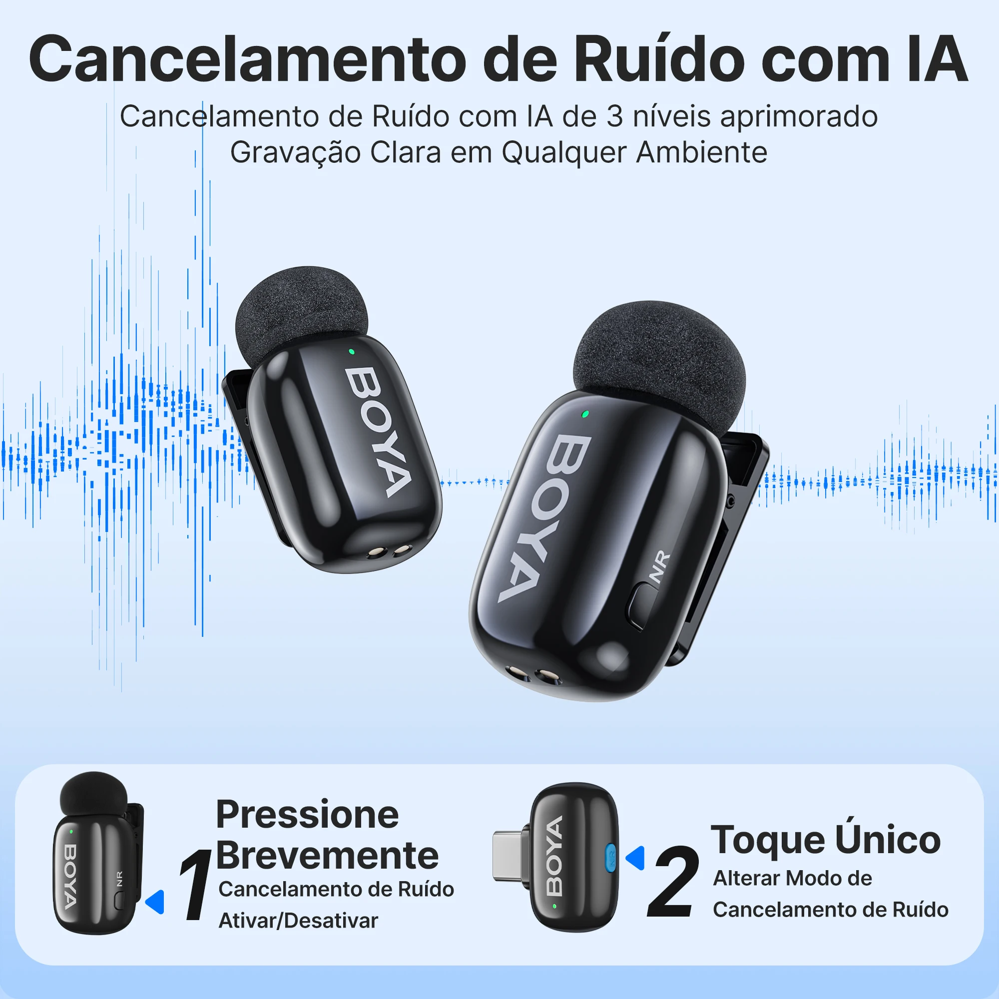 Cancelamento de ruído: com inteligência artificial e 3 níveis ajustáveis